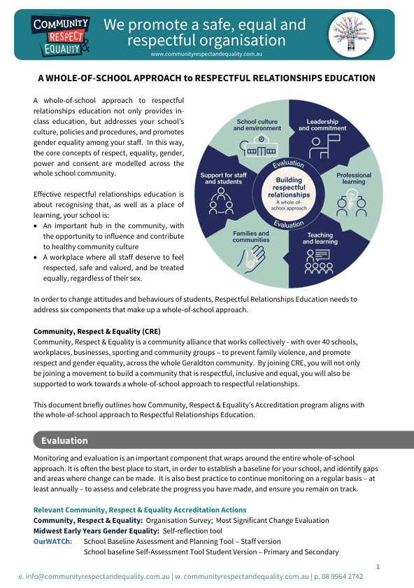 The Community, Respect & Equality Agreement is an opportunity for all organisations – whether it’s businesses, workplaces, sporting and community groups, educational settings, churches, or media – to play a role in preventing violence against women and children in our community.